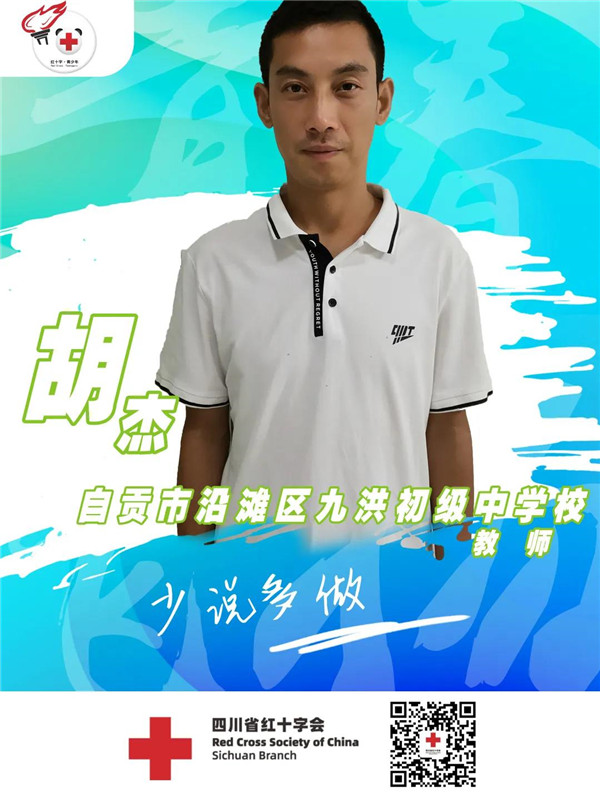 “学会一些急救小常识是非常有必要的,不但可以减少伤害,还可以挽救生命。”自贡市沿滩区九洪初级中学的胡杰老师在2014年成为了一名学校红十字会指导老师,在系统地学习了救护员的专业知识后,胡杰老师坚持在日常的教学中将自救互救知识教授给学生,“自救互救课程会教授心肺复苏、包扎等知识,这些知识在课本中是无法学到的,但是在学生们遇到紧急情况时,这些急救知识能够帮助学生更好地解决问题。”除了在本校开展活动,2019年,胡杰老师还到王井小学和九洪小学去宣教自救互救相关知识,让更多的人了解到急救的基本常识。