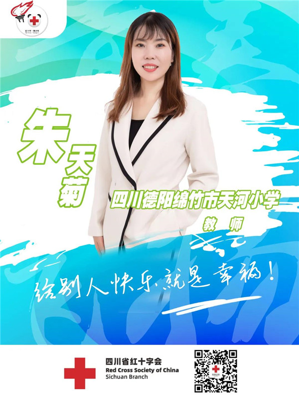 2008年汶川大地震,绵竹市天河小学受到重创。震后,江苏红十字会为天河小学全资捐建了一所永久性校园,天河人怀着一颗感恩的心走进了新校园。自2015年开始担任天河小学红十字工作负责人以来,朱天菊怀着一颗感恩之心,积极指导推动学校红十字工作。