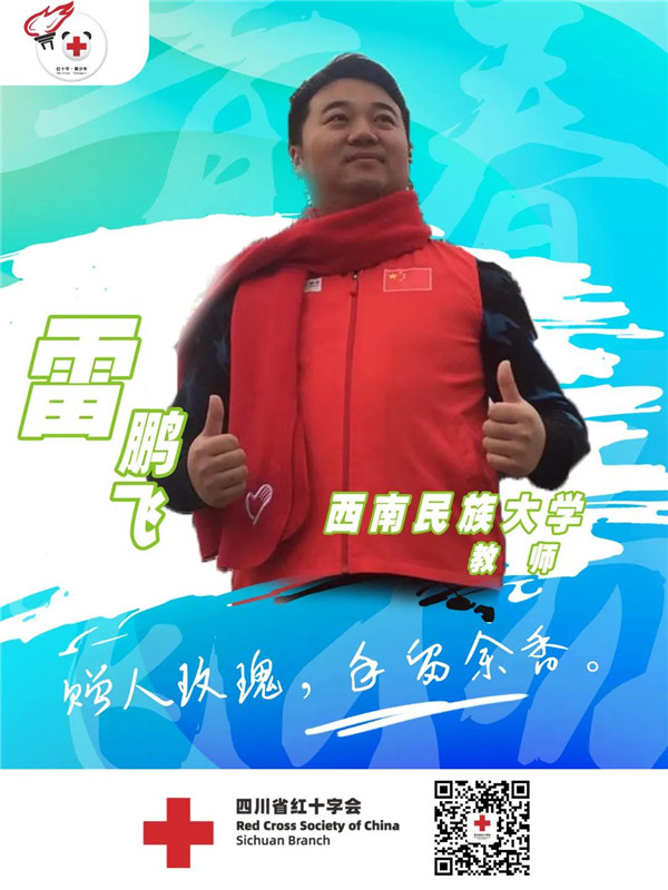 “我只是一个普通的人民教师,希望通过自己的行动号召更多青少年参与到红十字运动中,将小爱汇集成大爱。”担任西南民族大学红十字会学生分会指导教师以来,雷鹏飞积极指导校红十字会学生分会开展红十字活动。结合西南民族大学实际情况,他指导开展了如“献血车进校园”“禁毒防艾控结核进社区”“世界急救日系列活动”和“性教育公开课”等多项活动。