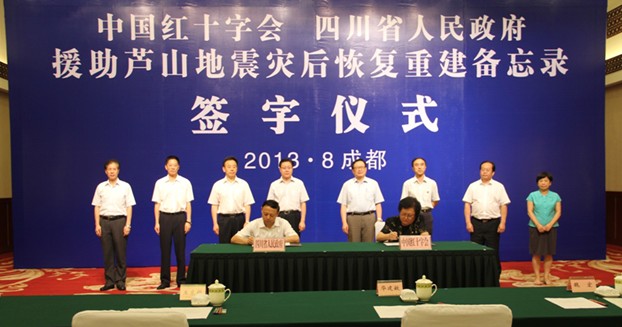 8月10日,中国红十字会与四川省人民政府在成都市金牛宾馆签署《关于援助芦山地震灾后恢复重建备忘录》。