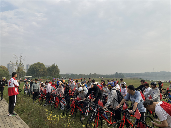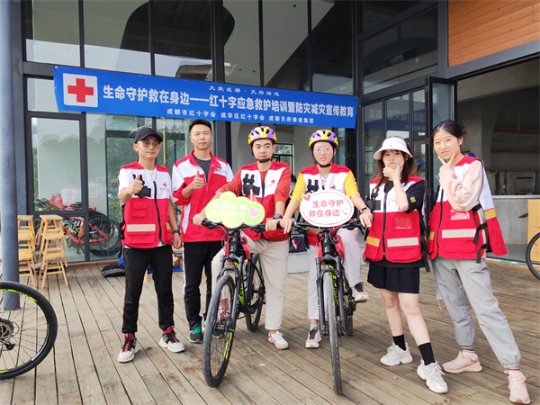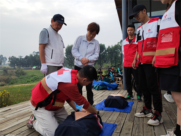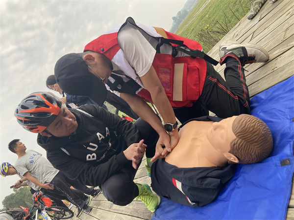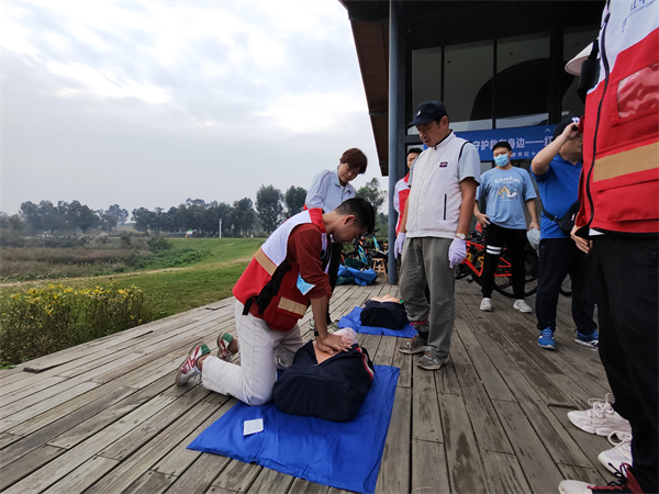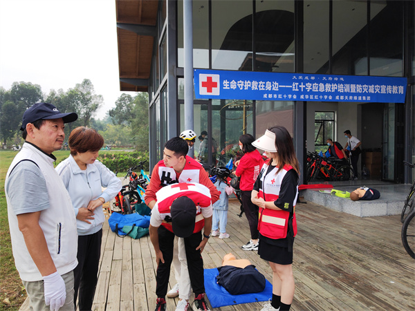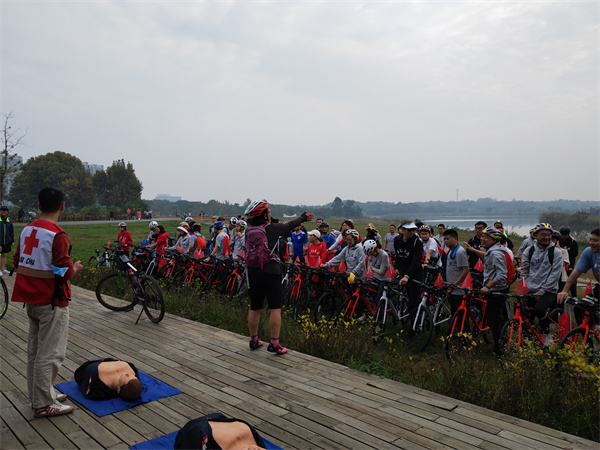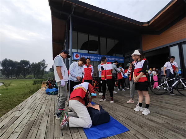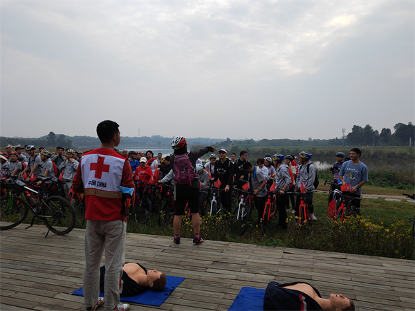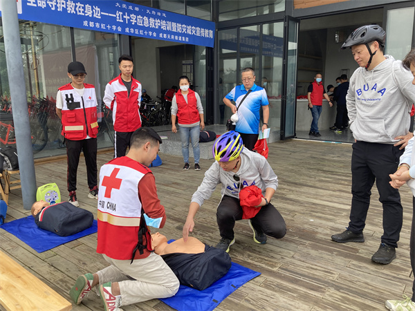 为进一步降低意外伤害对市民群众的损伤,提升市民群众的防灾避险和自救互救能力,10月23日上午,由成都市红十字会、成华区红十字会、成都绿道集团公司联合举办的“大爱成都·天府绿道 生命守护 ‘救’在身边—红十字应急救护培训暨防灾减灾宣传教育”活动在青龙湖公园进行,参加天府绿道骑行活动的北京航空航天大学四川校友会近100人,成华区红十字会2名红十字应急救护师资和5名红十字急救志愿者参与此次活动的培训和保障。