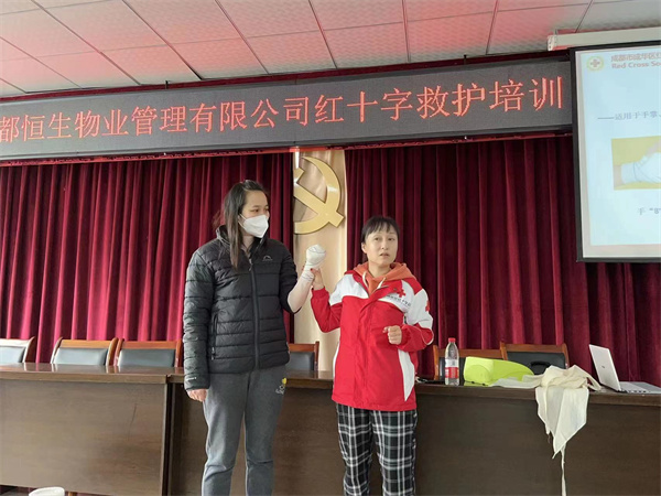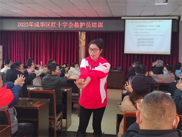 2月9日,为成都恒生物业管理有限公司开展红十字救护员培训,讲解了心肺复苏、创伤包扎等理论知识并进行实操演练,50余名职工取得救护员证。