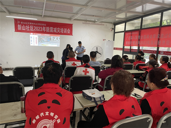 青龙街道新山社区红十字会开展新山社区2023年防震减灾培训会。活动中,红十字志愿者通过地震、火灾相关实际案例,提醒大家要提高防震减灾意识,重点围绕地震自救与避险措施、火灾自救与逃生等内容为大家进行讲解,同时教会大家如何正确使用灭火器,并进行现场展示。