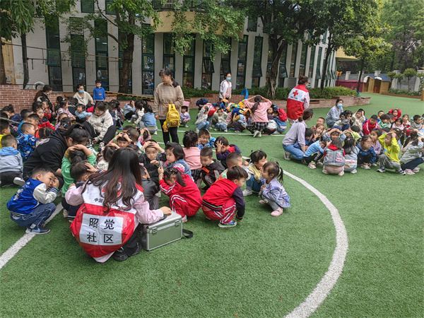 青龙街道昭觉社区红十字会联合十二幼北新分园组织全校师生利用课间操时间进行防震应急避险和疏散逃生演练活动。活动中,红十字志愿者向孩子们传授地震基本知识以及如何有效应急避震,教育小朋友们在地震发生时不要慌乱,要严格按照老师的指挥安全有序地逃生,以防发生踩踏等安全事故。同时还结合近期周边发生的溺水、车祸等意外事件,提醒师生们要重视安全问题。