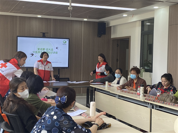 昭觉社区红十字会还联合青龙卫生服务中心在辖区开展了“中医养生健康知识讲座”,红十字志愿者从中医养生保健、饮食、生活起居、穴位按摩等方面进行讲解,耐心回答现场老年听众的问题并进行互动交流。