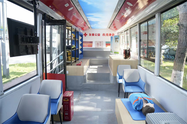 本辆安全主题巴士,是由成华区红十字会参与设计,青龙街道和致强社区联合成都公交集团客运市场部、北星巴士401车队、成华区应急局等单位利用报废公交车升级打造的“社区安全空间”。车厢内配备了红十字知识宣传区、电视教学区、安全知识宣讲区、互动学习区等教学区;车身印有“全龄友好 幸福出行”等警示语,车内印有“友善公益·救在身边”的红十字文化宣传语,相较于传统式的教学课堂,打造场景化、沉浸式的教学空间更能激发居民的学习热情,帮助居民更好提升自救互救能力,进一步助推党建引领社区“微网实格”治理工作纵深走实。