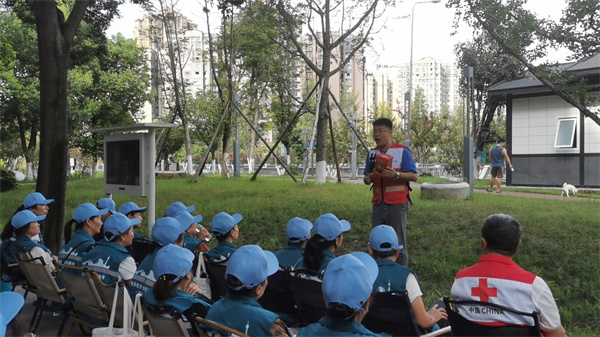 配套活动中,成华区红十字会派出优秀应急救护师资,为社区30余名网格员和往来群众开展安全主题培训,重点围绕近期高温、发生火灾逃生自救、公交车逃生、用电用气安全和心肺复苏术等知识内容进行讲解,进一步提升社区在面对突发意外事件时的急救能力,为建设平安社区贡献红十字力量。