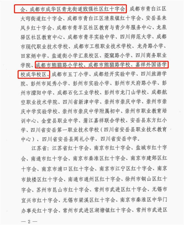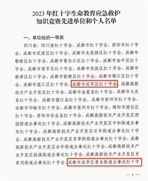 近日,中国红十字会总会印发2023年红十字生命教育应急救护知识竞赛活动先进单位和个人名单,成华区红十字会、成华区青龙街道红十字会、青龙街道致强社区红十字会、成都市熊猫路小学校、成都市熊猫路学校、嘉祥外国语学校成华校区荣获单位组织一等奖,成华区红十字会工作人员刘川荣获个人组织奖一等奖,向获奖对象表示祝贺!
