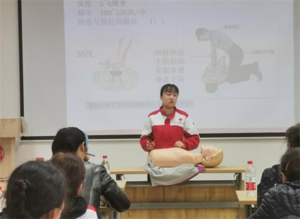 近日,海滨湾社区红十字会在社区开展了一场救护知识普及培训,30余名社区居民、物业人员参加。培训现场,成华区红十字会应急救护老师围绕心肺复苏术及AED使用、气道异物梗阻和创伤包扎等内容进行讲解,进一步提高社区居民在面对突发意外伤害事件时的自救互救能力。