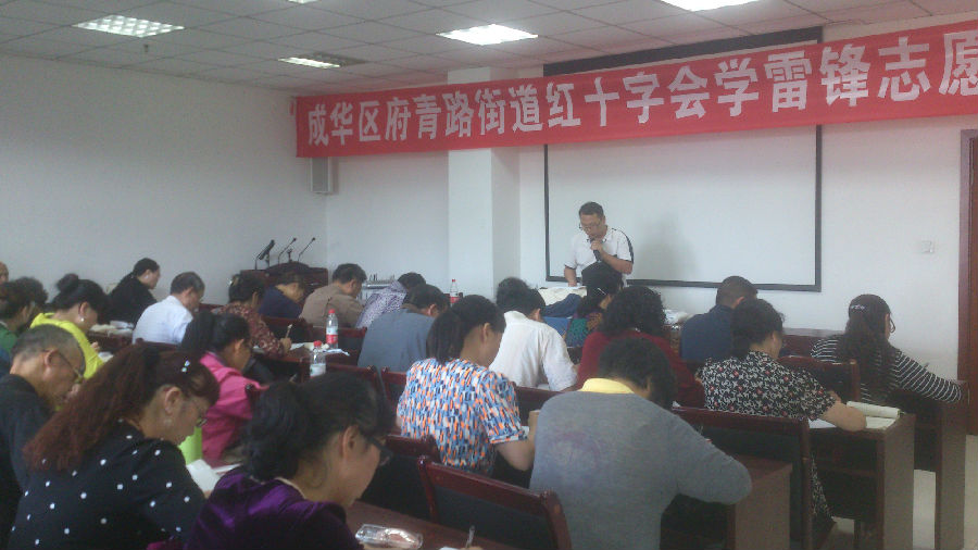 为弘扬 “人道、博爱、奉献”的红十字精神,普及卫生救护知识,弘扬“当好人、做好事”的学雷锋志愿者精神,9月22日至9月23日,成华区红十字会在府青路街道办事处开展了为期两天的急救员培训班,府青街道办组织本辖区各院居民参加了此次培训,培训了合格急救员54名。24日继续开展应急知识普及培训,辖区内居民及机关工作人员100余人参加。本次培训活动有效地向辖区居民普及了应急救护知识,提升了居民的自救、互救意识和能力,提高了街道和社区红十字志愿救护队伍的基础技能。