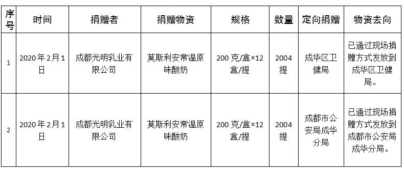 成都市成华区红十字会接收捐赠物资公示表(2020年2月1日)