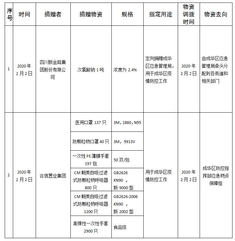 成都市成华区红十字会接收捐赠物资公示表(2020年2月2日)