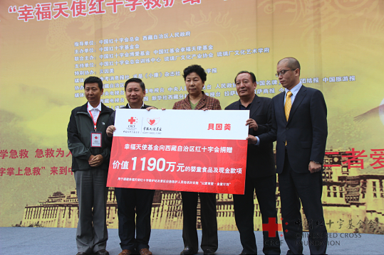 仪式上,幸福天使基金携爱心企业贝因美,积极践行“以爱育爱”的理念,向西藏自治区捐赠190万元现金及100万元贝因美婴童食品,主要用于在西藏5个5A/4A级景区援建“幸福天使红十字救护站”;在藏区旅游景区培训1000名应急救护人员;实施“以爱育爱•金童计划”;以及“公益扶贫计划”等。