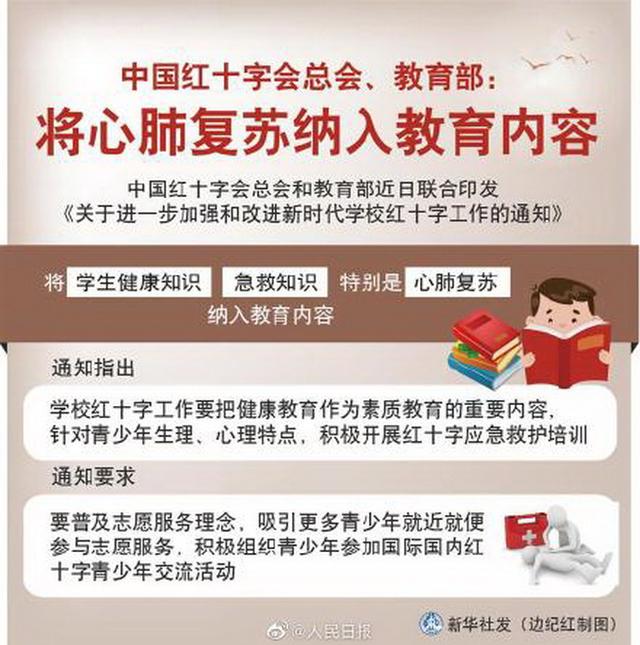 通知指出,学校红十字工作要把健康教育作为素质教育的重要内容,针对青少年生理、心理特点,积极开展红十字应急救护培训,把学生健康知识、急救知识,特别是心肺复苏纳入教育内容。采取多种形式,传播健康行为与生活方式、疾病防控、心理健康、生长发育与青春期保健、安全应急与避险等知识,提高学生健康素养。要普及志愿服务理念,吸引更多青少年就近就便参与志愿服务,引导、支持红十字志愿服务队伍策划和组织实施志愿服务项目。要将中华民族孝慈仁爱传统与国际红十字运动原则相结合、培育社会主义核心价值观与传播红十字精神相结合,弘扬红十字精神,传播人道理念。要积极组织青少年参加国际国内红十字青少年交流活动,增进青少年友谊与合作。要加大投入建设博爱校医室,建好用好红十字救护站、红十字文化传播基地、人道主义教育基地、生命健康安全体验教室等阵地,探索政府、学校、社会共建共享红十字青少年阵地机制。