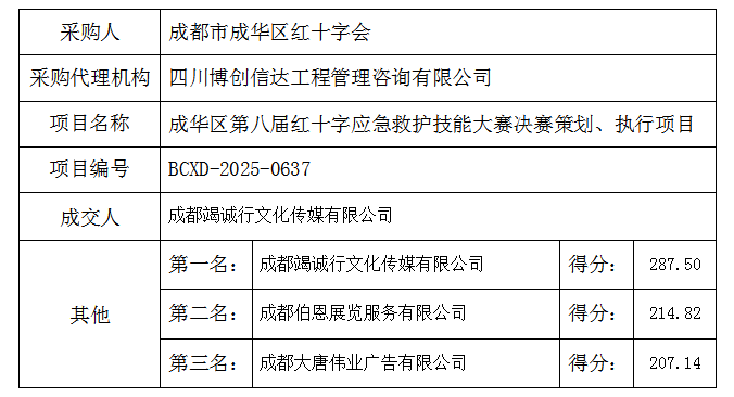 成华区第八届红十字应急救护技能大赛决赛策划、执行项目开、评标会于2025年5月30日在四川博创信达工程管理咨询有限公司开、评标室进行,评审结果经采购人确认,成交结果公示如下:
