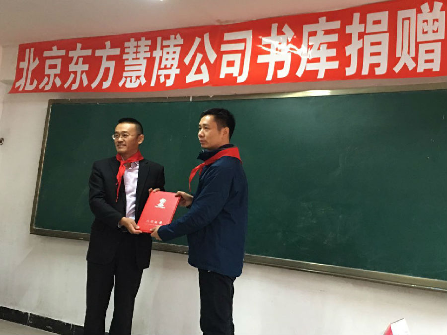 2015年11月20日,世界儿童日,北京东方慧博人力资源顾问有限公司联合中国红十字基金会走进打工子弟学校英才学校良乡校区,为学生们带去了千余本优质图书和羽毛球拍、跳绳等体育器材,并和学生们畅谈未来梦想和职业规划。