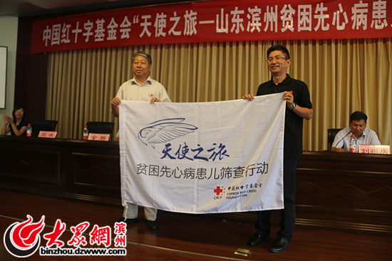 “天使之旅——山东滨州贫困先心病患儿筛查行动”由滨州市红十字会联合滨州市卫计委共同协调组织,滨州医学院附属医院具体执行。现场,中国红基会救助救护项目总监周魁庆将“天使之旅”旗帜转交给滨州市红十字会党组书记、常务副会长刘冰,标志着“天使之旅”在滨州正式启动。