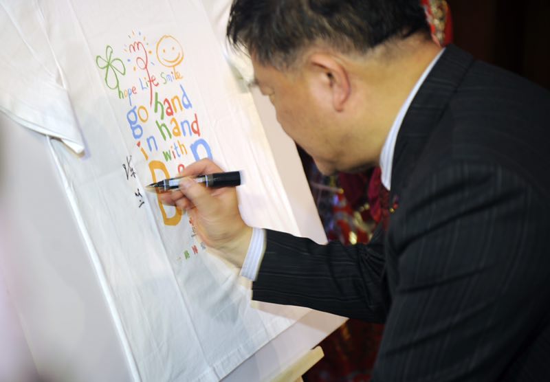 仪式现场,陈竺会长向活动捐赠方步长集团总裁赵超颁发了捐赠证书,并将天使之旅——蒙古国先心病患儿筛查救助活动的旗帜转交给内蒙古自治区红十字会和人民医院负责人手中,蒙古国红十字会健康促进部项目负责人Gantulga Batbyamba博士通过邮件和视频对中国红十字会的人道救助表示欢迎和感谢。仪式上陈竺会长等领导和步长集团代表、自治区人民医院代表在筛查活动纪念体恤衫上签名。