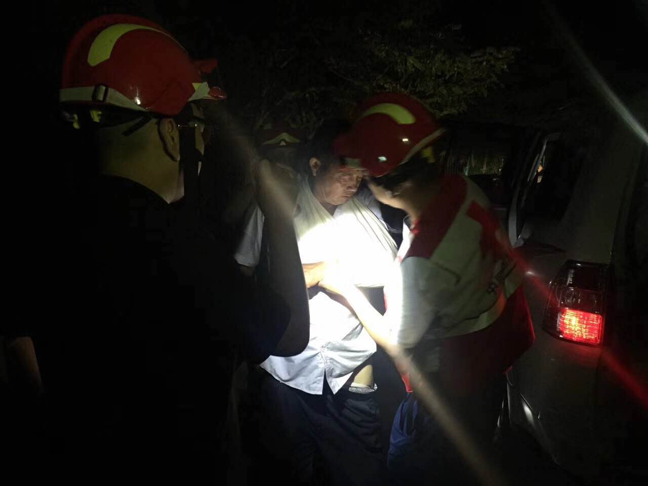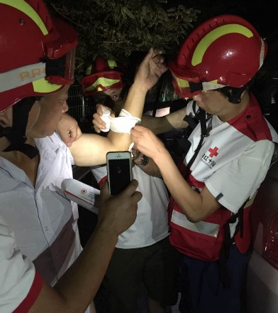 8月12日晚10点半,四川工作组运输物资至距离九寨沟新县城约20公里处,发现前方一货车侧翻、1人受伤,随即先行实施探伤止血,待救护车到来后,全队继续出发赶往目的地。