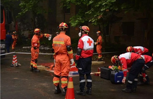 在雅安芦山的建筑综合救援科目中,南充红十字救援队5名队员与德阳消防14名指战员相互协作,共同配合,在进行破拆过程中互相学习对方的器材装备和先进的技术操法。