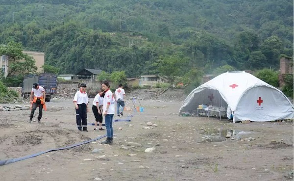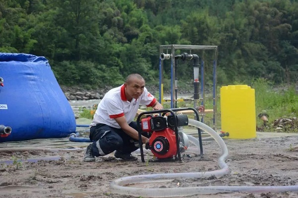 中国红十字(四川)供水救援队在雅安天全现场取水进行作业,为此次演练提供生活用水,红十字急救员为消防官兵提供了急救保障。